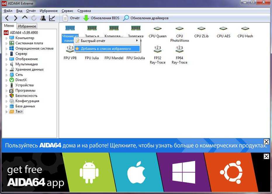 Чтобы добавить этот тест в меню «Избранное», щёлкните на нём правой кнопкой мыши и в контекстном меню выберите пункт «Добавить в список избранного»: