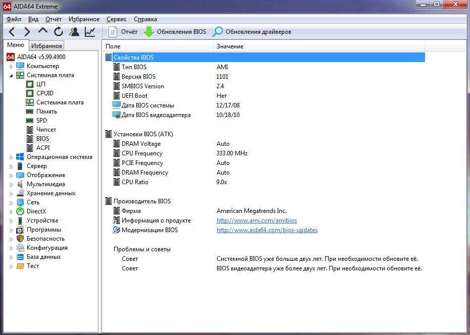 После этого в основном окне AIDA64 будет отображаться такие сведения о BIOS, как его свойства, установки, производитель, а также советы по использованию BIOS.