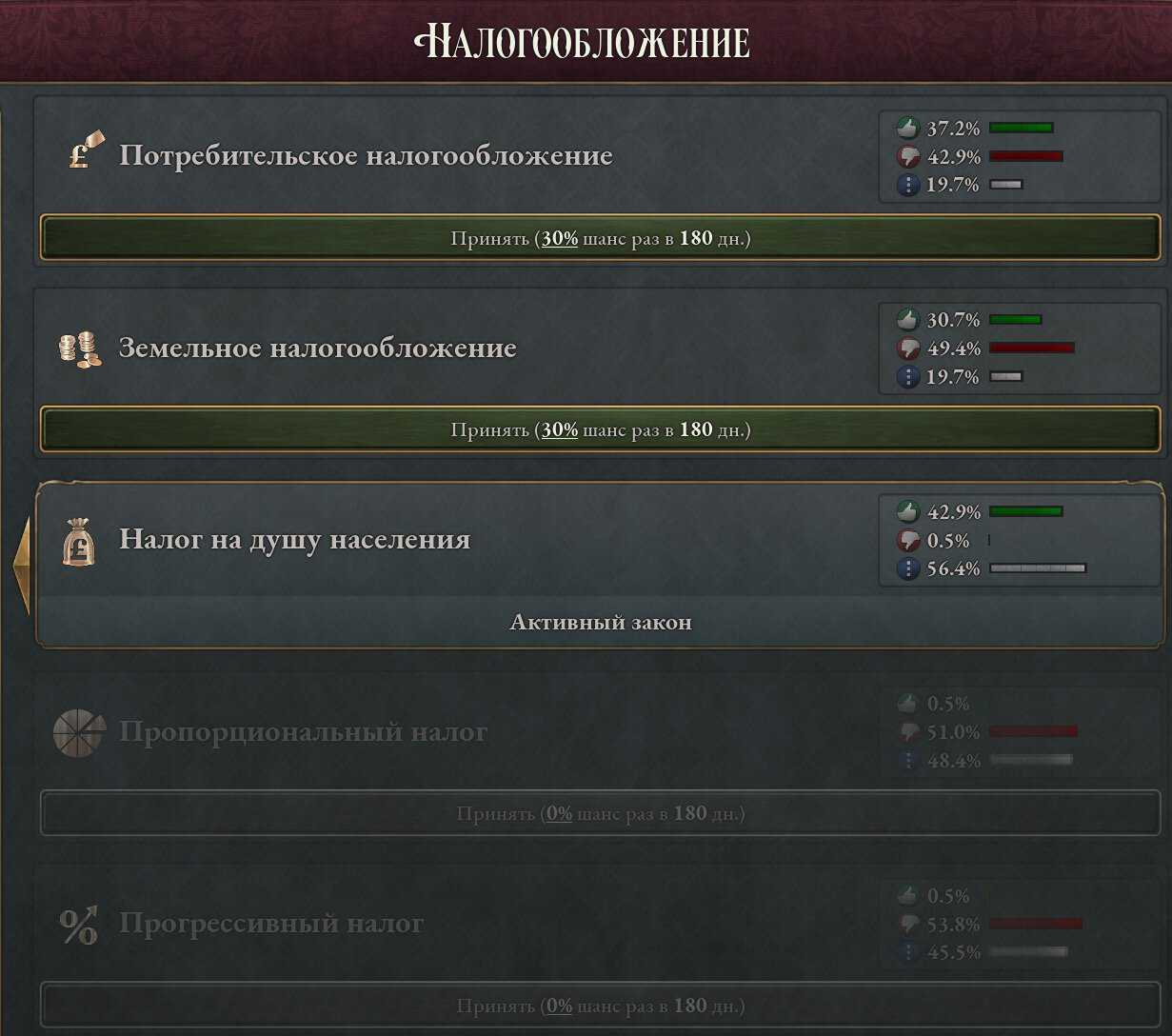 Но что, если вы хотите изменить какой-нибудь закон, например, отменить крепостное право или ввести прогрессивный налог? Для этого нужно, чтобы такой закон поддерживала влиятельная Заинтересованная группа. Чем больше групп будут поддерживать закон, тем больше шанс быстрого принятия. Можно добавить подходящие группы в правительство, повышая его легитимность. Но если вы добавите группы с низкой поддержкой населения, легитимность упадет, с ней снизятся и шансы на принятие любых законов.
