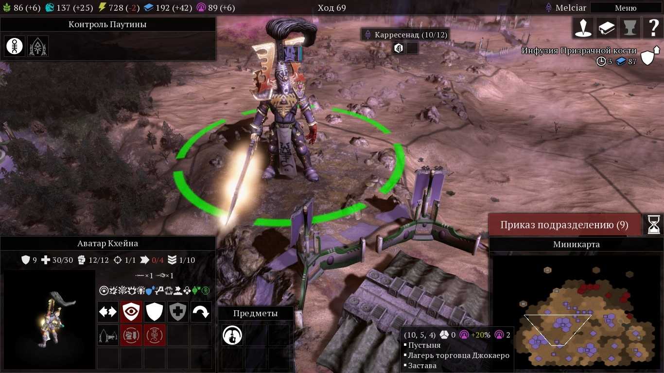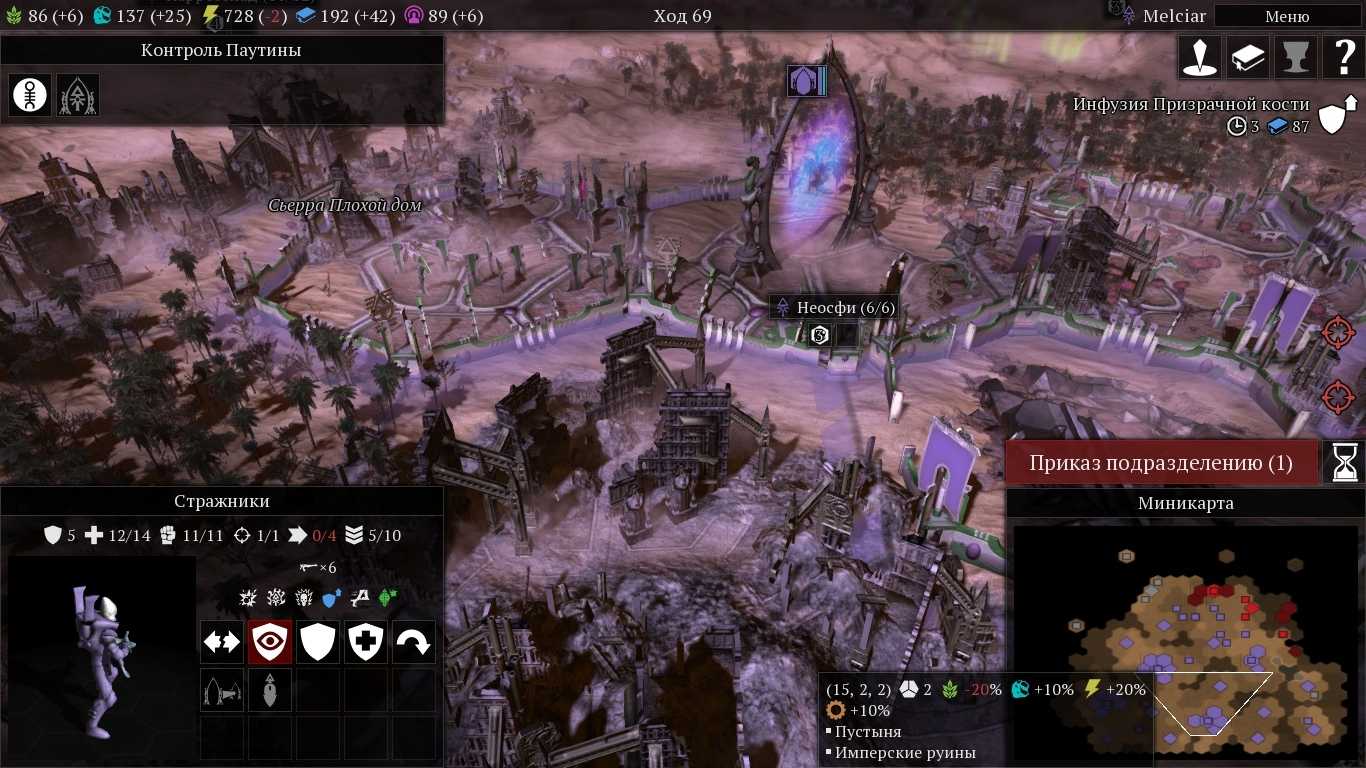 Если говорить о влиянии, не следует забывать и об ещё одной особенности расы Эльдар. Растут их города в два раза медленней, чем у прочих фракций. Как следствие – влияние придётся постоянно тратить на использование способности “призыв азуриан”, которая выравнивает рост популяции. На каждое такое использование нужно потратить ещё 20 единиц влияния, а работает способность всего пять ходов. Так что любой гекс, дающий прирост влияния для Эльдар будет буквально на вес золота. Радости от того, что ключевые здания и сооружения будут простаивать довольно мало.