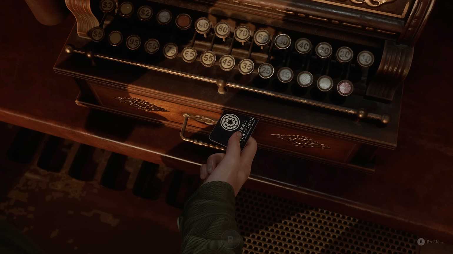 Чарли взламывает замок выдвижного ящика с помощью визиткиСкриншот: игра The Dark Pictures Anthology: The Devil in Me / Supermassive Games