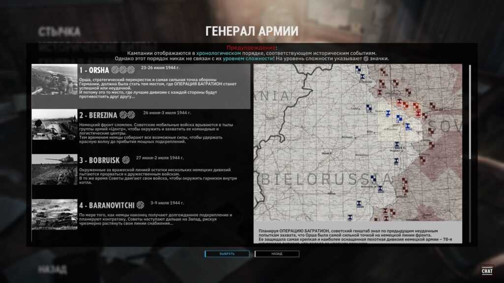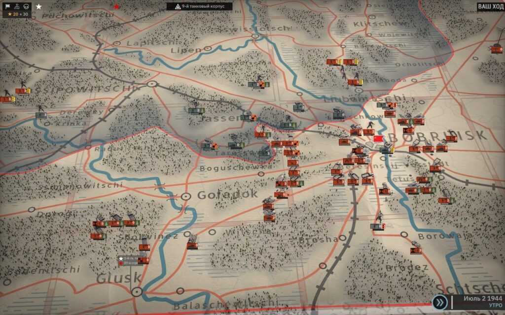 В зависимости от стороны (которую для каждой кампании можно выбрать добровольно – СССР или Германия) вам предстоит защитить или захватить какой-то объект (например, город или высоту). Передвигайте батальоны по карте, а при их столкновении перемещайтесь в тактический бой, в котором может участвовать не более трёх батальонов с каждой стороны. Само передвижение батальонов основано на классической системе очков действий. В кампании действует та же механика динамической линии фронта, что и в сражениях – побеждая врага и занимая территорию, вы будете двигать линию фронта, и чтобы захватить целевой объект, нужно «поглотить» его своей территорией.