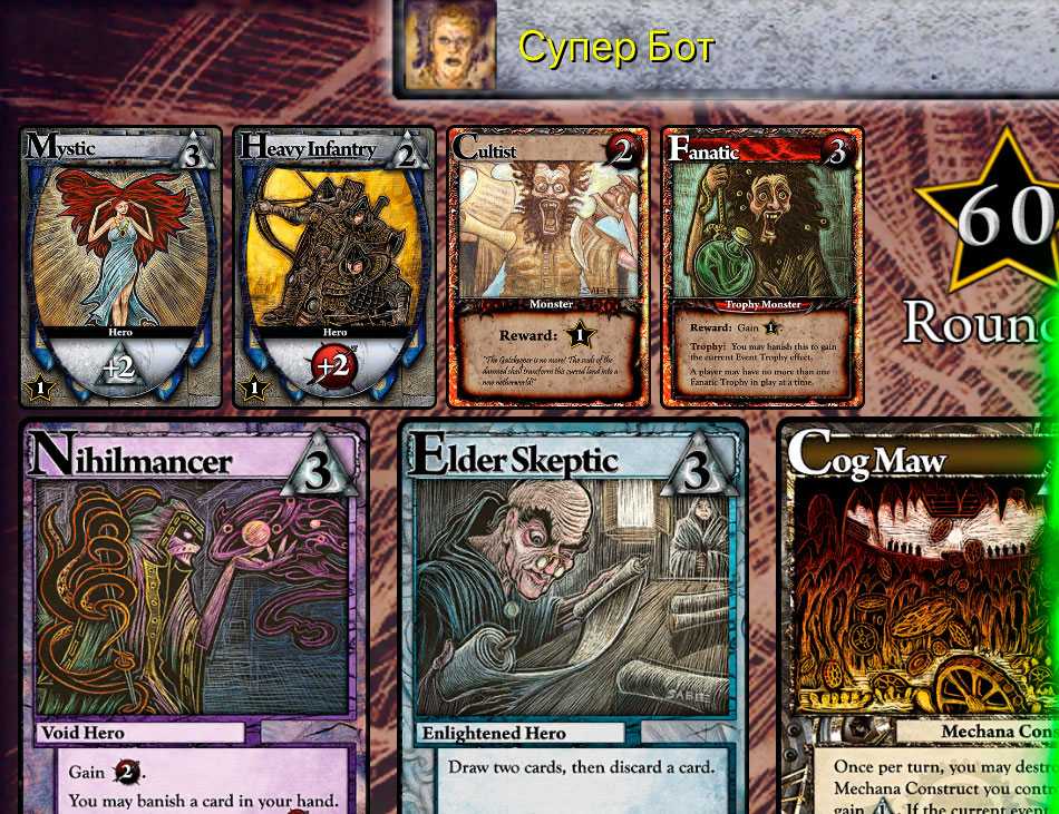 Моя жена любит играть до 120 (максимум для дуэли), так как так партии дольше и можно лучше прокачать руку, а я в последнее время предпочитаю разыгрывать именно рекомендуемое число очков (60), так как тогда партия вовремя завершается. В таких партиях у AI больше шансов выиграть у меня, так как в долгих партиях обыграть ботов проще.