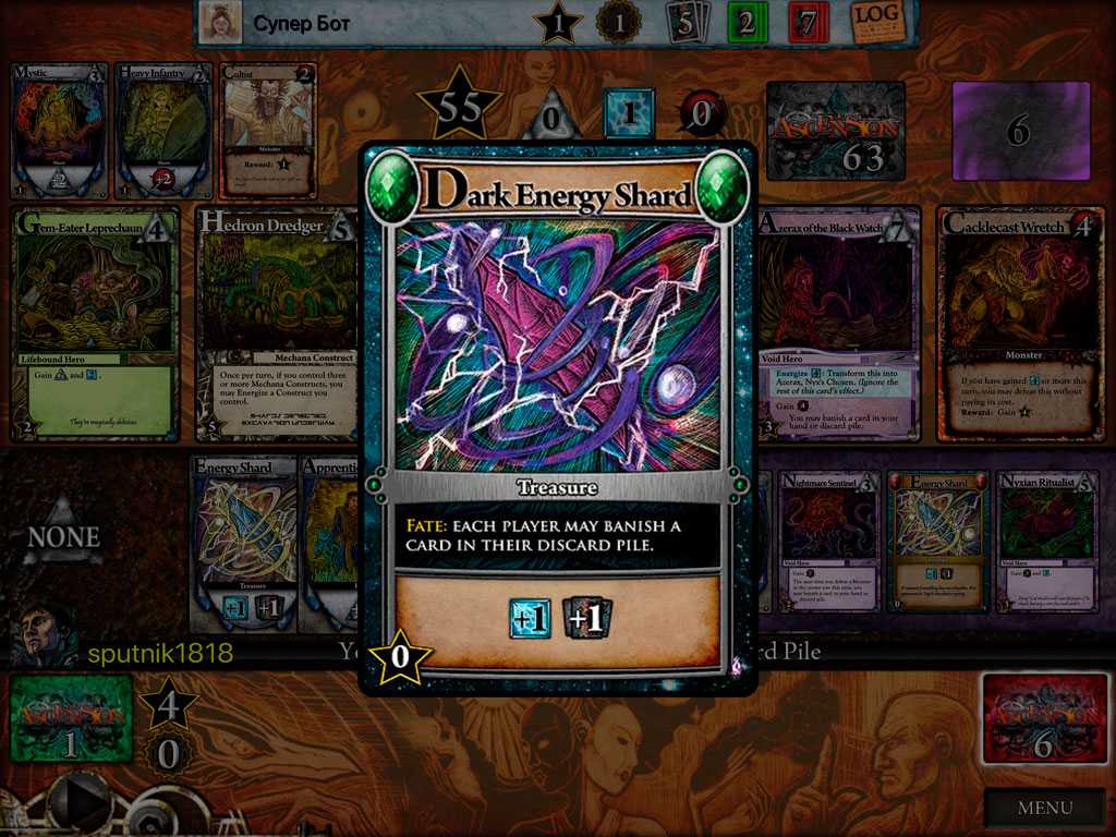 Dark Energy Shards – такие же карты как сокровища, только обладающие эффектом судьбы (какое-то действие при выходе в центральный ряд).