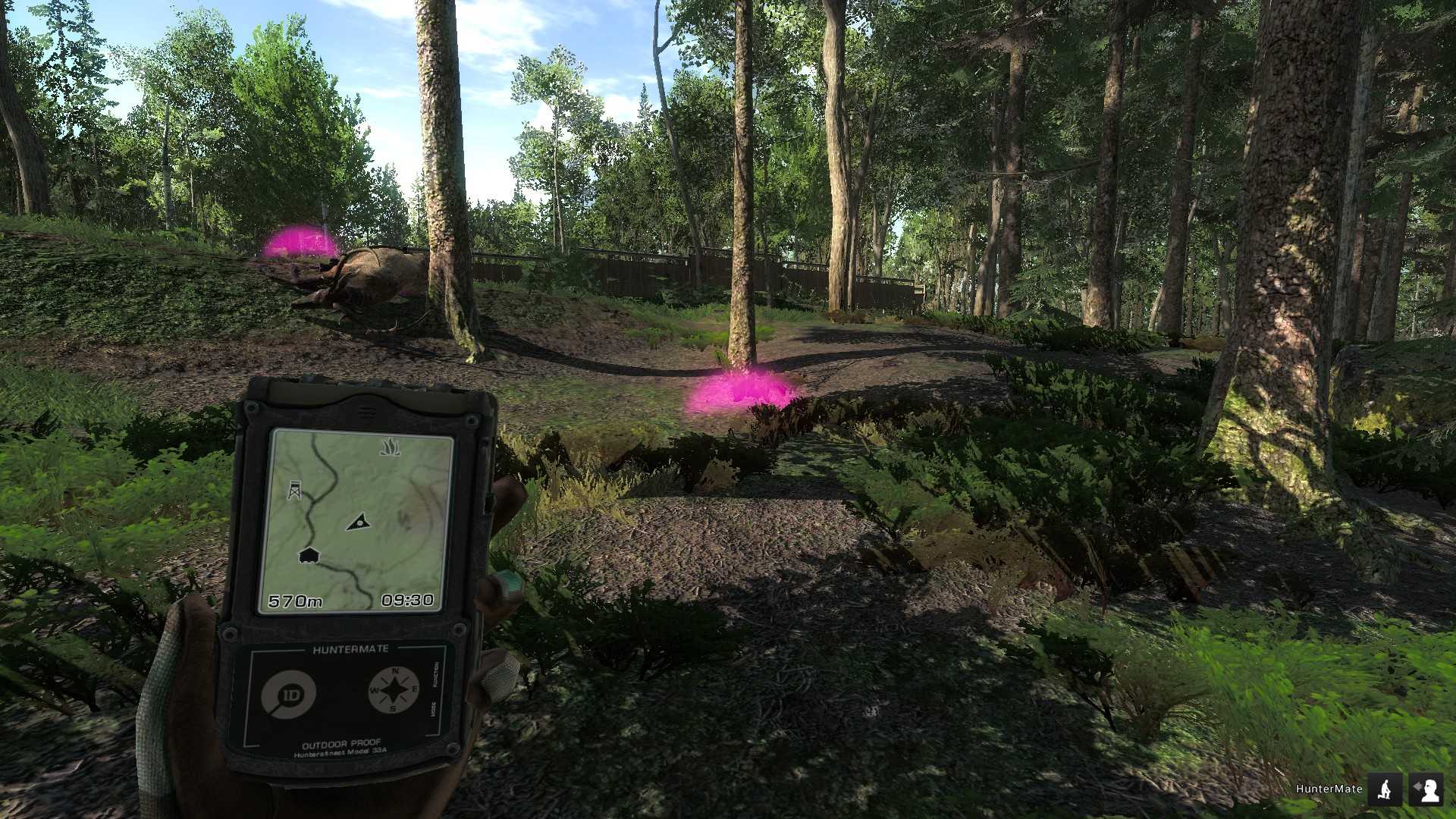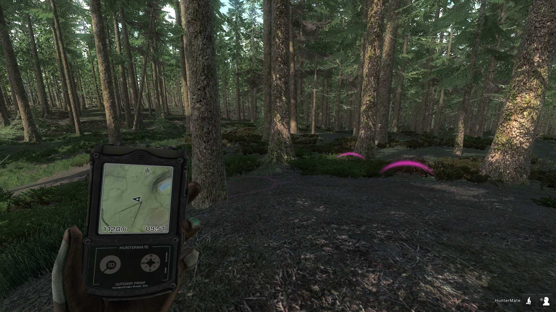 Скорее всего, сначала услышите чей-то звук. Потом можно увидеть след, обозначенный цветным пузырём (цвет можно настроить). В обоих случаях на HunterMate появится знак лапы в углу. Надо кликнуть (обычно ЛКМ), тогда увидите инфу по зверю. Потом надо вернуться к карте (обычно ПКМ) и увидеть, откуда пришел звук или куда ведут следы. Пока вы не нацелились на определенную добычу, стоит кликать на каждый след – это постепенно наращивает скилл следопыта и через какое-то время вы будете знать не только «кто», но и что делал, и когда, и насколько он упитан, и возможные очки добычи. То же самое надо сказать о скилле наблюдения. По возможности, наблюдая живность в бинокль, прицел или непосредственно, надо дождаться, чтобы он определился (то есть высветился контуром). С нарастанием скилла скорость определения будет расти. Но – для каждого вида -отдельно!
