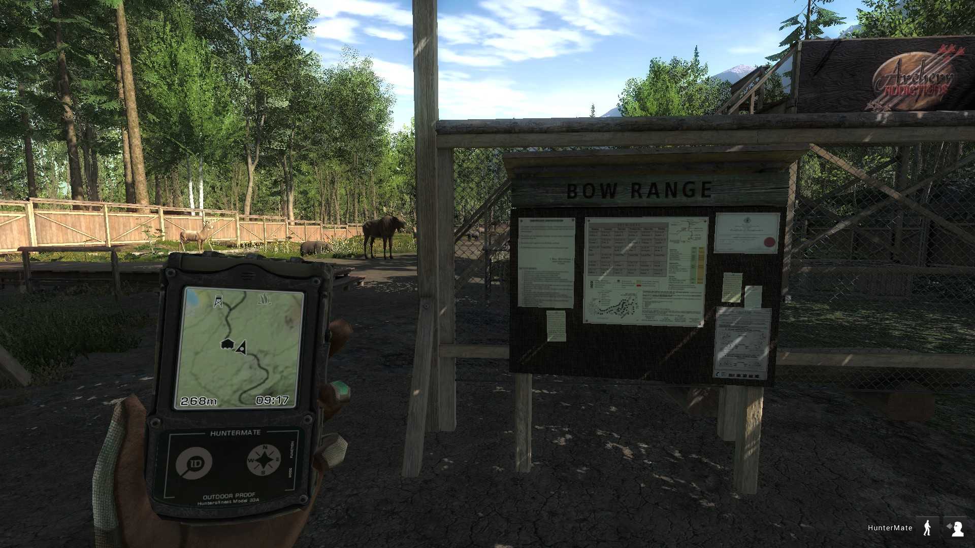 Постреляли? Пойдем погуляем. Не забудьте настроить графику. Иногда бывает очень красиво. Посмотрите, что там у вас на кнопках от 1 до 8. Оружие можно сразу зарядить. В дробовик – зеленую дробь (для птичек и кроликов), или красную картечь (для мелких оленей, собачек и кошечек), или черный жакан (для любых оленей, кабанов и медведей). Ну, пошли. Спешить не надо, первые признаки дичи появляются только через 2 минуты после начала игры. Лучше идти по дороге, слушать птичек и обозревать виды. Уберите оружие и возьмите HunterMate .
