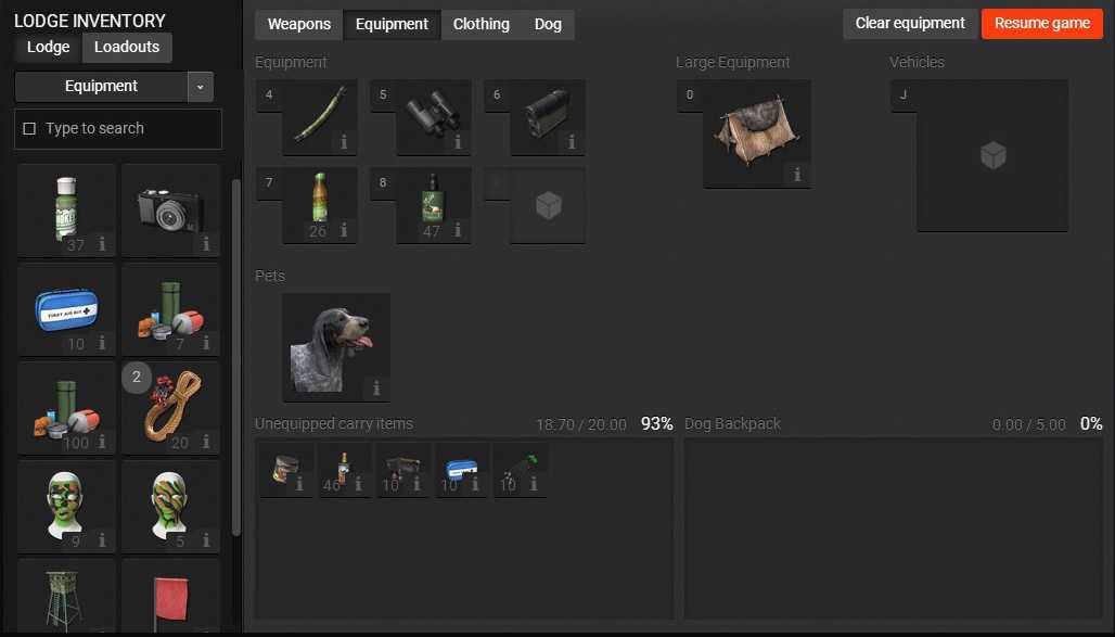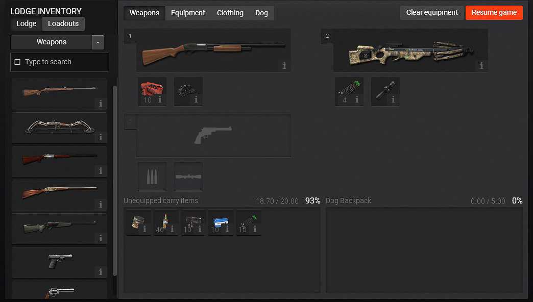 Сразу откройте инвентарь (как только уйдете с базы, у вас останется доступ только к той части инвентаря, который расположен в слотах). Насколько я знаю, с самого начала игры вам доступен однозарядный дробовик 12 калибра и винтовка .243 с 4-х кратным прицелом, с достаточным количеством патронов к ним (этих патронов у вас всегда будет в достатке – запас возобновляется с началом новой игры). Это позволяет охотиться на всё, что бегает, прыгает и летает, кроме больших коров и бизона. Также у вас есть бинокль, мычалка (манок для всех оленей, но не Elk и не лосей) и базовый набор одежды. Разложите свое хозяйство по слотам. В новом интефейсе инвентаря есть три закладки: Оружие, Снаряжение, Одежда. Внизу – содержимое рюкзака, это доступно всегда, но для использования предмета нужно переместить его в слот.