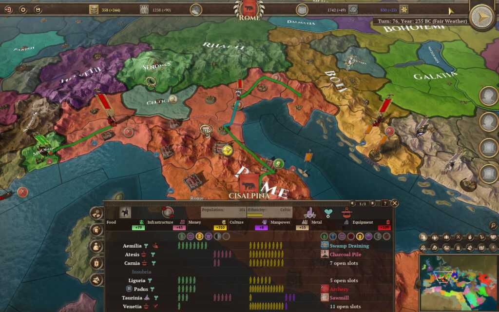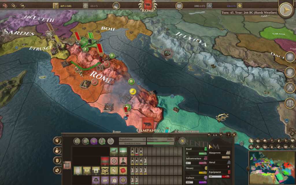 После того, как вы завоюете много территорий, строить здания и перераспределять вручную население в каждом регионе станет довольно обременительным. Эту проблему разработчики решили провинциями. Каждый раз, когда вы захватываете достаточно регионов из заранее заданных в игре провинций, вы можете создать провинцию. После создания провинции становится возможным автоматизировать распределение населения и строительство. Можно включить что-то одно из этого, либо сразу обе автоматизации. Доступны также фокусы, определяющие, в каком направлении ИИ будет строить и распределять население – экономика, культура и так далее.