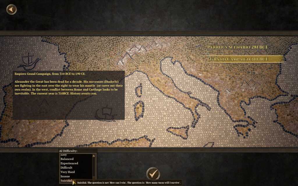В игре присутствует аж 7 уровней сложности, причём “сбалансированный” стоит на втором месте. Дальше – сложнее. Любителям пострадать советую выбрать самый последний. Да, как и во многих играх, ИИ получает искусственные бонусы на сложных уровнях. К счастью, эти бонусы не затрагивают систему сражений – там всё по честному на любом уровне.