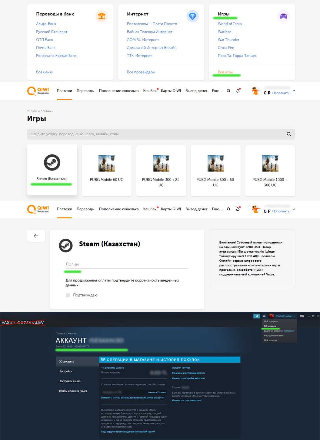 Когда средства переведены, заходим в «Платежи», открываем «Игры», выбираем «Все игры» и там ищем Steam (Казахстан) — пусть вас это не пугает, способ 100% рабочий для обладателей российских аккаунтов.