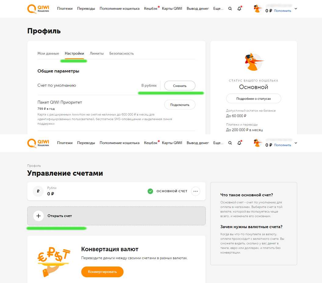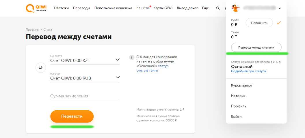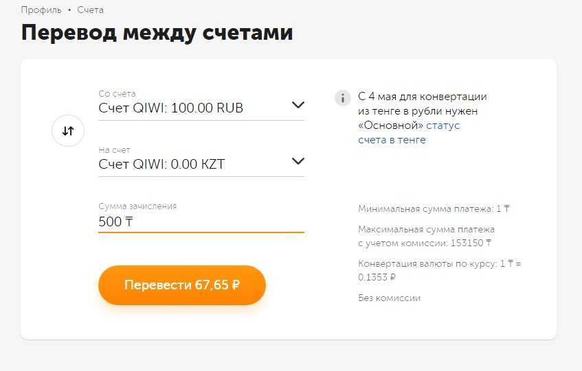 Если вы захотите дальше что-то покупать, то закинуть рубли в тенге можно через QIWI-кошелёк. Учтите, что для дальнейших операций нужен статус кошелька Основной — для этого придётся верифицировать аккаунт с помощью паспорта. Создаёте аккаунт, если его нет, верифицируете, а после создаёте дополнительный счёт в тенге. Далее закидываете деньги на счёт — у меня не вышло закинуть их напрямую в тенге, так что пришлось перекидывать со счёта на счёт, но комиссии за это не взяли.