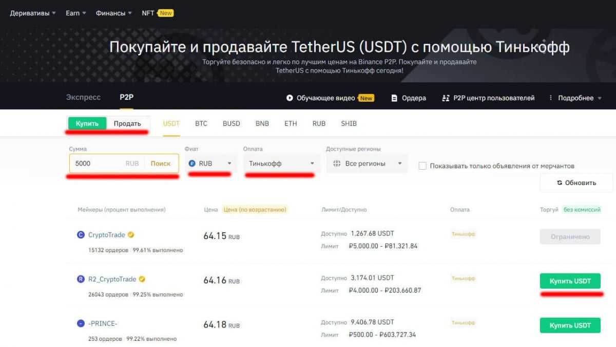 - Перейдите на страницу Binance P2P. Переключатель над списком предложений должен быть установлен в положение «Купить».
