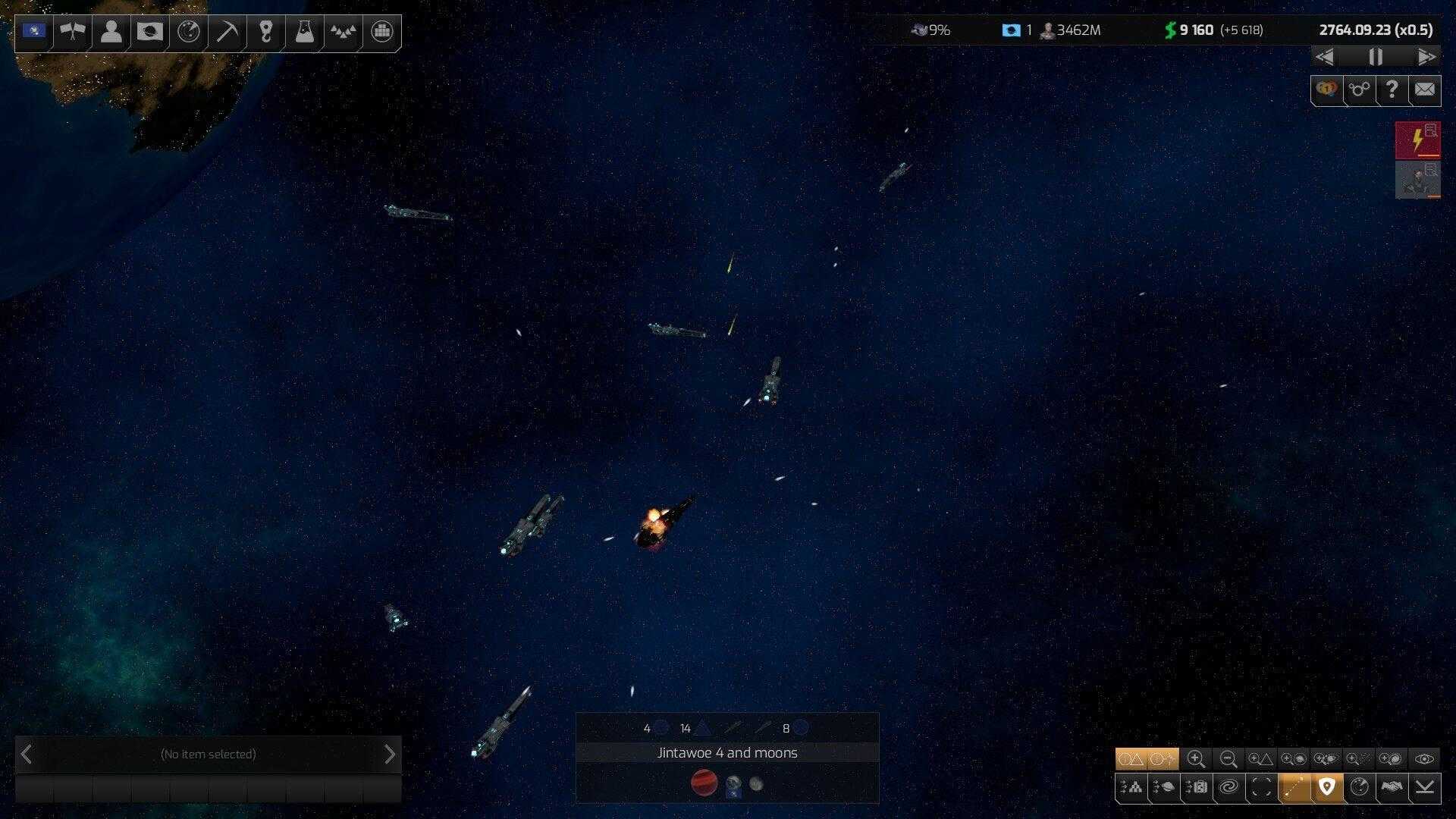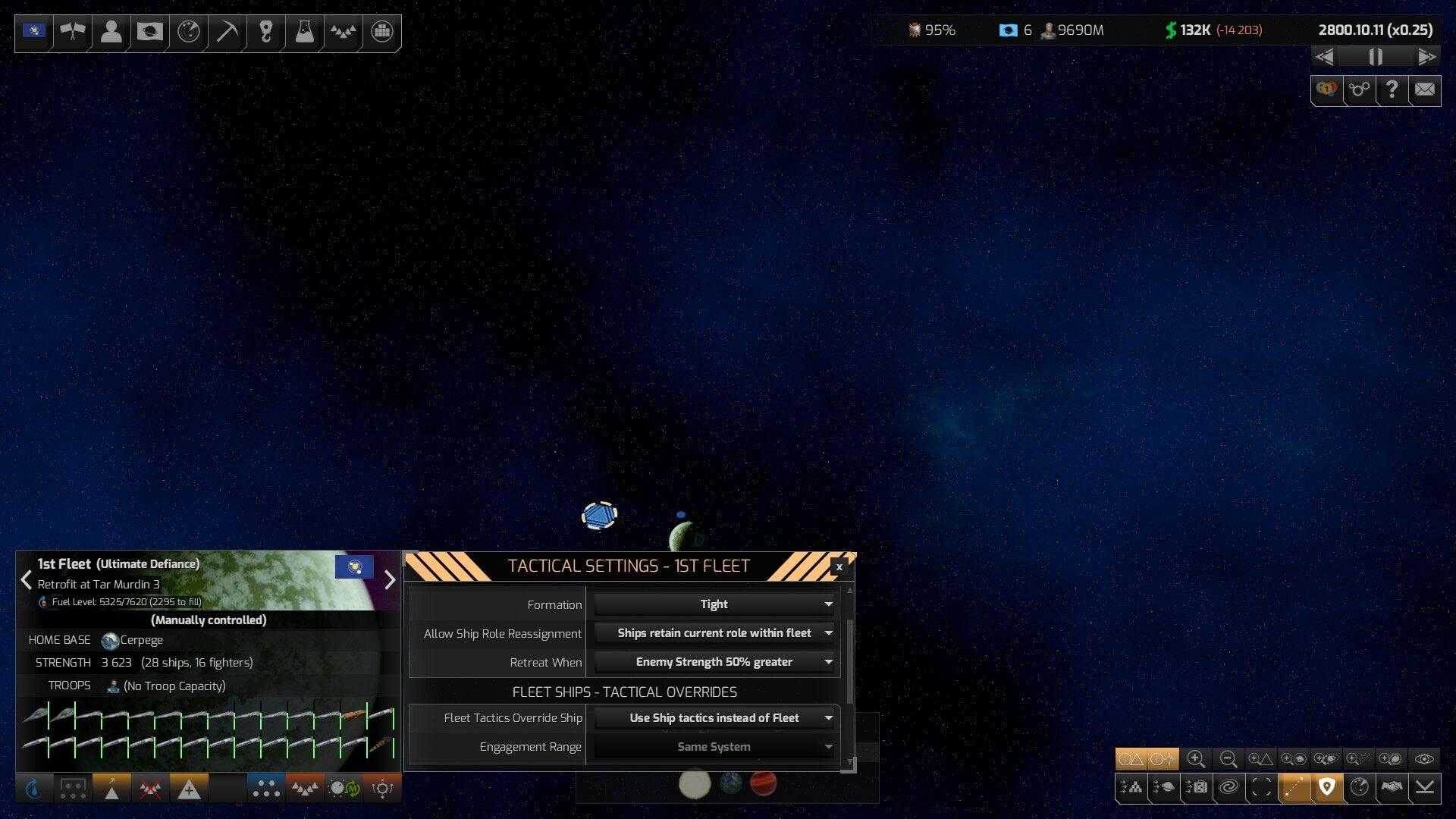 Как известно, добрым словом и пистолетом можно добиться большего, чем просто добрым словом, поэтому боевая система является неотъемлемой частью 4X-стратегий. Distant Worlds 2 предполагает, что боевые действия в космосе ведутся между флотами. Флоты же являются чем-то большим, чем просто большой кучей боевых кораблей. Нужны заправщики, ремонтники, корабли поддержки, транспорты… Мощный флот, брошенный в глубину вражеской территории, но лишённый приписанных к нему танкеров и ремонтников, достаточно быстро потеряет боеспособность, даже если будет по своей чистой огневой мощи значимо превосходить флот противника.