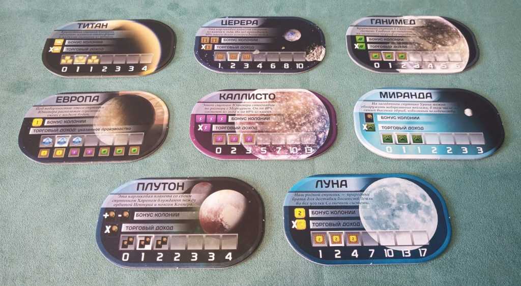 Во время подготовки к игре случайным образом выкладывают по одному жетону колонии за каждого игрока и дополнительно еще два жетона. На каждом жетоне изображена колония (это спутники и карликовые планеты), описаны бонус колонии и доход колонии. На крайнее левое положение трека торгового дохода колонии выкладывается белый маркер.