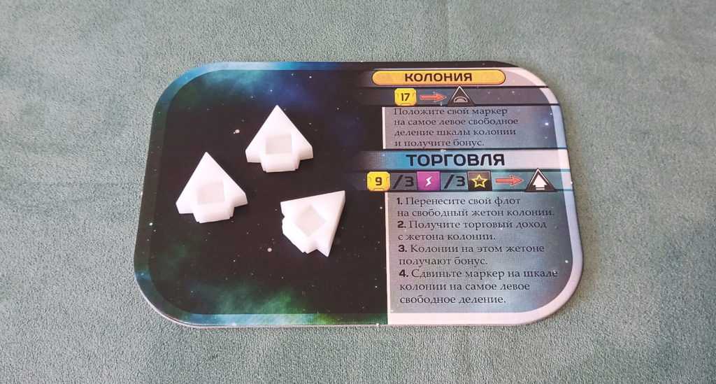 Действием «Торговля с колонией» вы перемещаете фишку своего флота на жетон колонии и получаете торговый доход по показателю белого маркера, а владельцы колоний получат бонус этой колонии. После торговли с колонией белый маркер сдвигается на крайнее левое свободное деление.