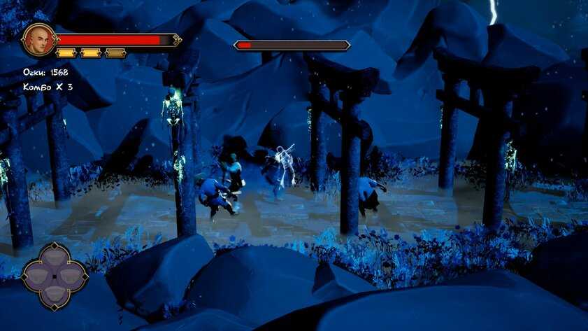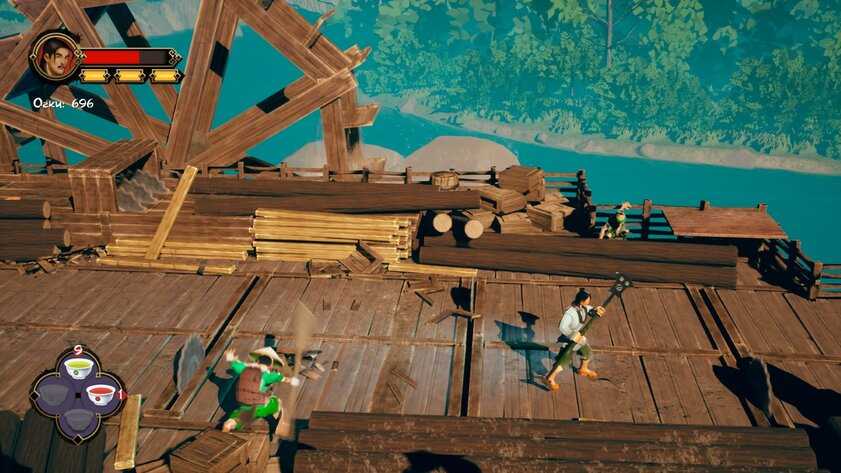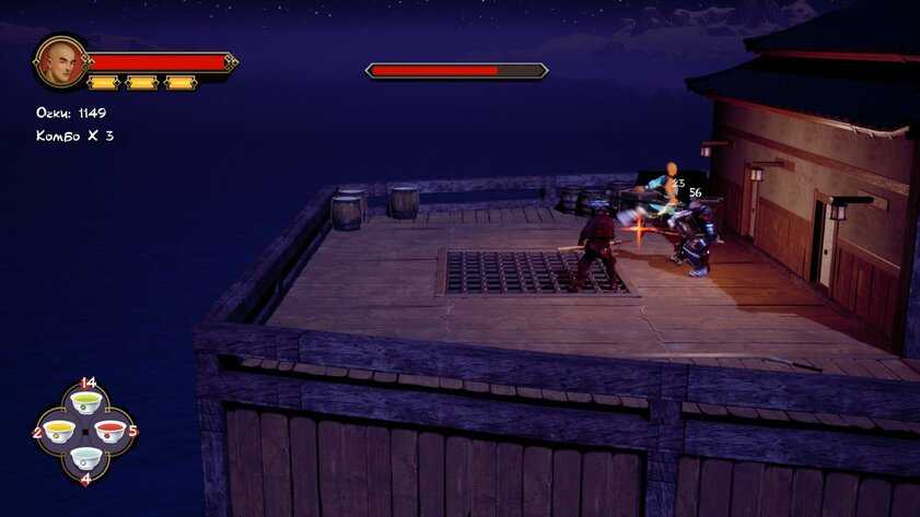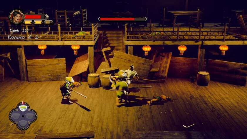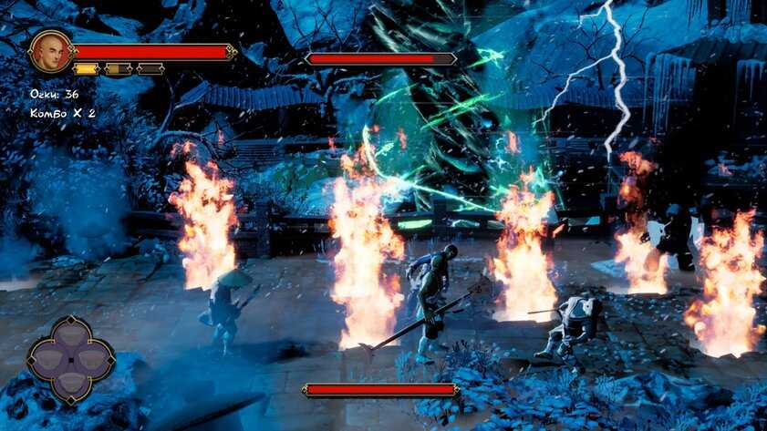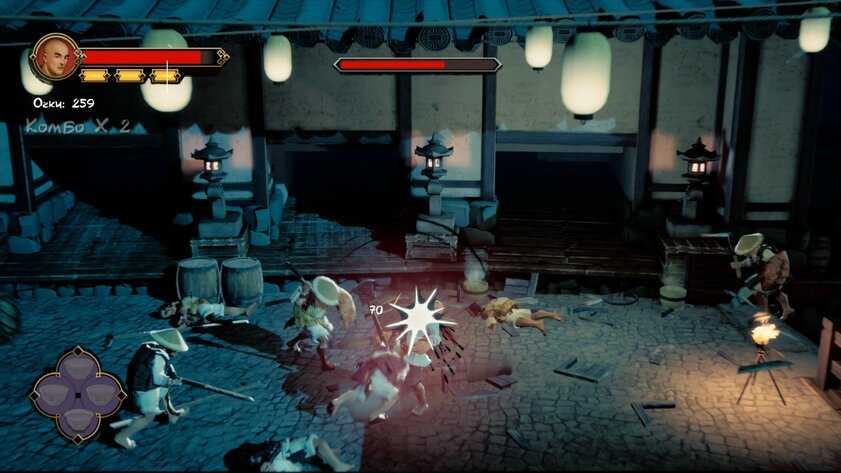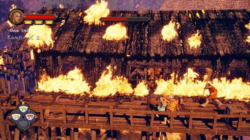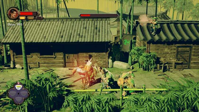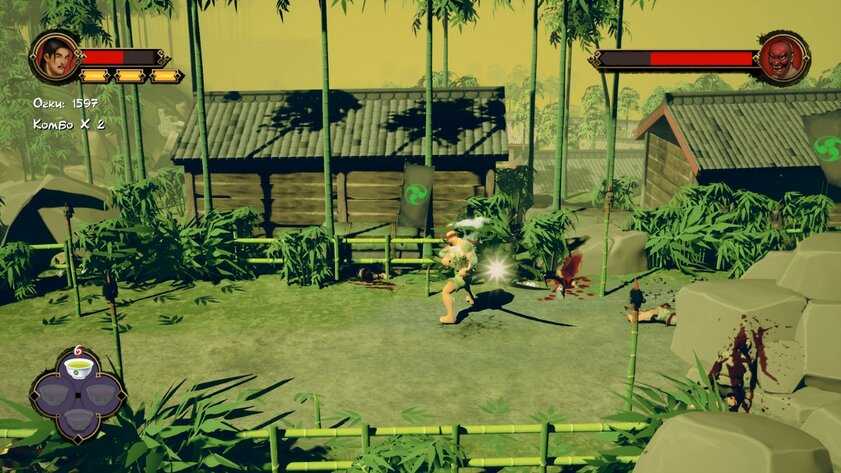 Отдельного внимания заслуживают локации. Это не обычные коридоры, а открытые пространства, в которых окружение также участвует в схватках, что вносит разнообразие в игровой процесс. Так, на лесопилке есть пилы, которые наносят урон врагам и игроку, в ночной деревне в землю бьют молнии, помогающие в бою, а в финальной локации вообще растет бамбук, который мешает уворачиваться от ударов и заставляет игрока не просто бездумно жать на кнопки, а следить за движениями персонажа.