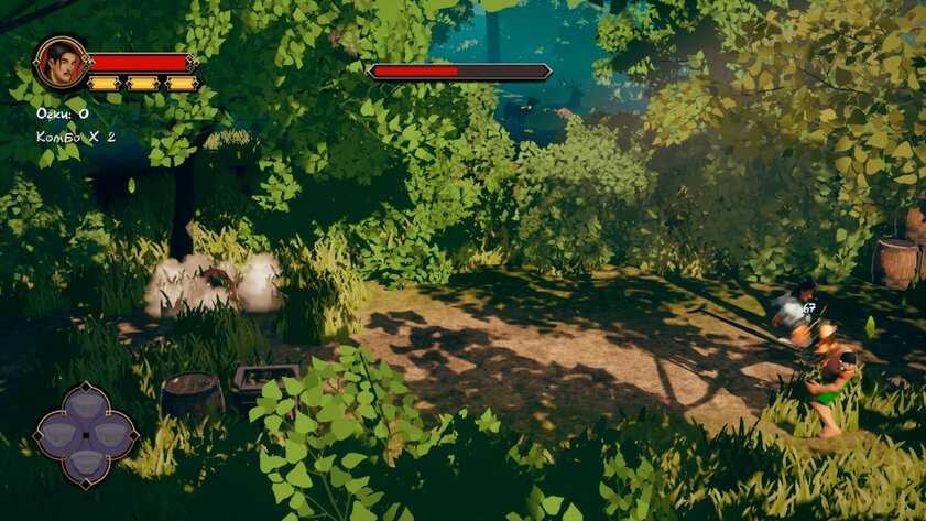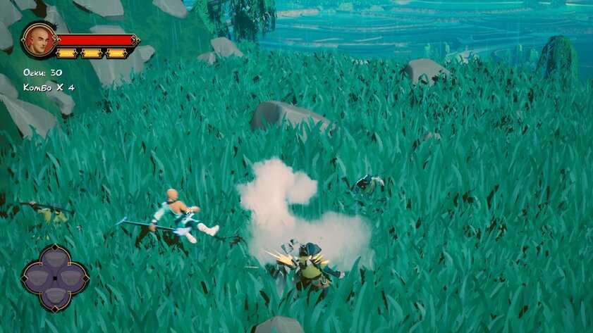 С другой стороны, если у вас есть геймпад или вы осилили управление на клавиатуре, игра подарит море удовольствие от сражений с врагами. Во-первых, система боя очень гибкая: есть удар ногой, который сближает персонажа с противником; есть удар-тычок, который не наносит много урона, но у него крайне короткая анимация удара; и есть размашистый удар посохом, наносящий приличный урон. Добавляем сюда возможность кувырка-уворота — нужно лишь нажать на нужную клавишу, чтобы персонаж перекатился в том направлении, куда он смотрит. А ещё есть возможность парирования всех ударов в радиусе.