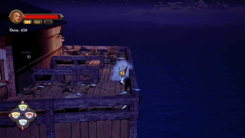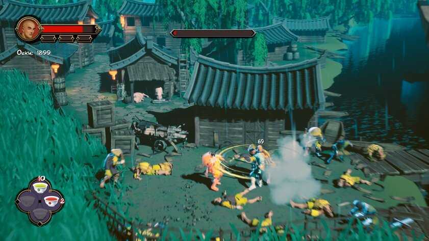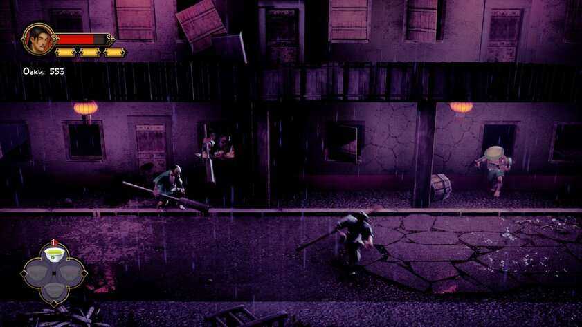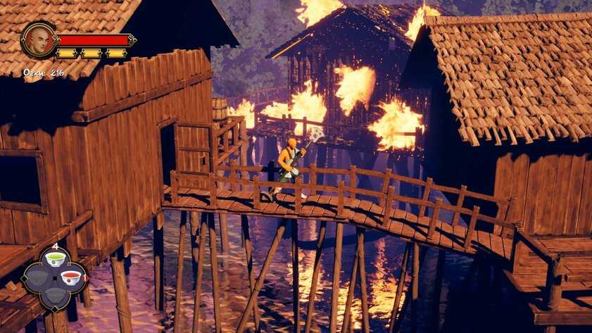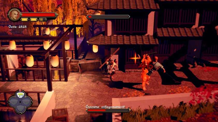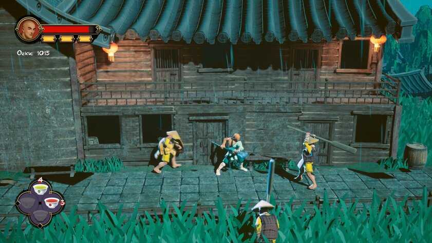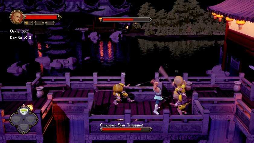 Сюжет в игре есть, но средненький. Не бесит и хорошо. Присутствуют сцены жестокости, которые при такой рисовке смотрятся явно не в тему. Выруливает посредственный сценарий за счёт великолепной русской озвучки.— Пошли на рыбалку!— Я не умею…— Чё там уметь? Наливай да пей.Продолжительность игры 4-5 часов. Мало. С другой стороны, возможно это я слишком быстро приспособился к ультимативному увороту, в результате чего просто забил на второстепенные задания. Да и по хорошему они однотипные. Бывают задания спасти кого-то, успеть куда-то. Но это же Битэмап, его такими мелочами вряд ли можно разнообразить.При такой скромной продолжительности, лицензия на рыбалова с посохом в 9 Monkeys of Shaolin стоит 500 рублей. Хотя должна стоить максимум 150.Ну да ладно. Хорошо сегодня половили. Давай уже собираться домой, сын, а то ниндзя под вечер особенно бойкие…