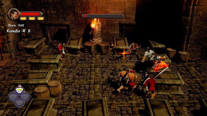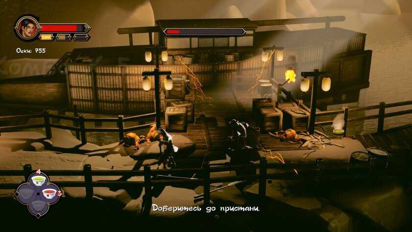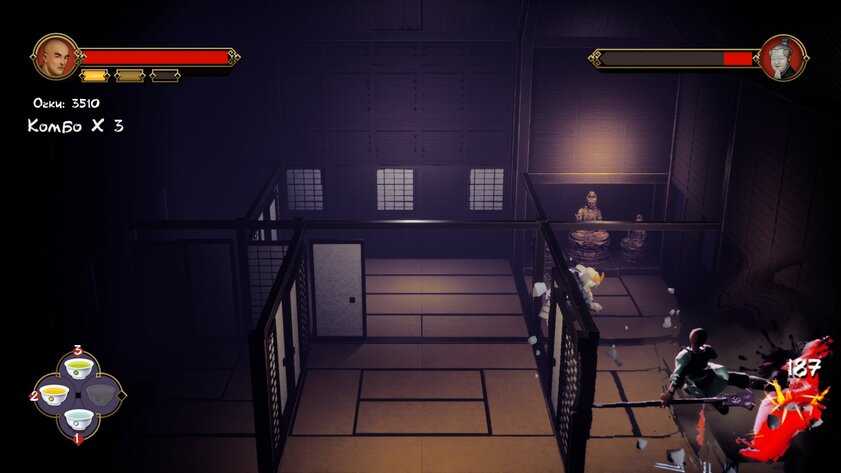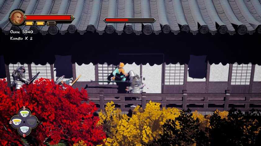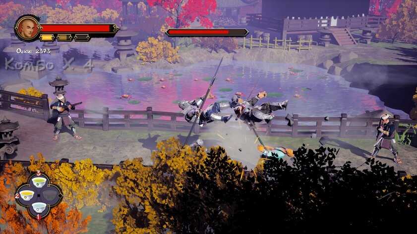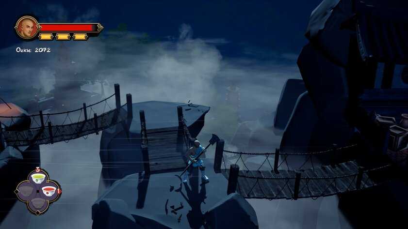 Буквально каждая локация удивляет интересными элементами. Редкость для жанраНо на этом разработчики решили не останавливаться, добавив некий элемент платформера. Иногда персонажу нужно прыгать между обрывами по небольшим площадкам, иногда нужно вовремя пробегать, чтобы не попасть в огненную ловушку. Есть уровни, где по земле ездят пилы, наносящие урон, а на одном из заданий я не добивал врагов, а просто сталкивал их вниз с горы. Главное не переборщить с ударом ногой — сам персонаж тоже любит падать вниз. А ещё здесь есть вертикальные уровни, локации, где для открытия двери нужно сначала кого-то убить, локации с пушками, палящими ядрами, и много чего интересного.