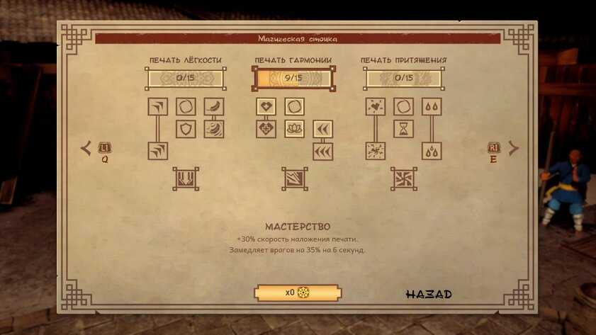 Печать Гармонии ещё и персонажа хилит, что крайне полезноВторой путь развития — прокачка стоек. Есть базовая стойка, акробатическая и магическая. Первая отвечает за урон и мелкие бонусы от обычных атак, вторая позволяет улучшить удары с использованием энергии Ци, третья отвечает за параметры печатей. В самом начале рекомендую прокачивать сначала все ветки базовой стойки до максимума, потом центральные ветки остальных стоек — это наиболее эффективные приёмы. Потом, когда они будут прокачаны на 100%, можно переходить на другие ветки и качать то, что вам важнее всего. Ресурсов для открытия всех умений во всех ветках хватает, об этом можете не переживать.