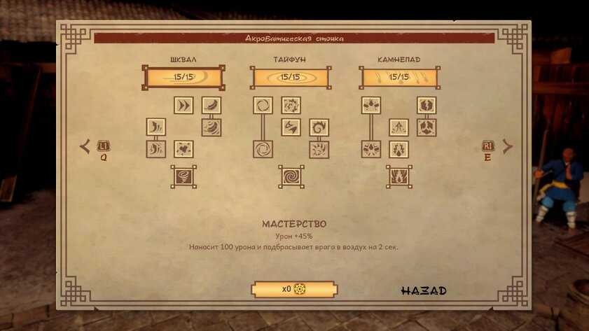 В конце каждой миссии игрок получает очки улучшения, которые можно потратить в лагере у монаха-тренера. Разговор с ним вызывает на экран разветвленное древо техник, в котором основным предметом улучшений являются комбинации и приемы для каждой из трех стоек: