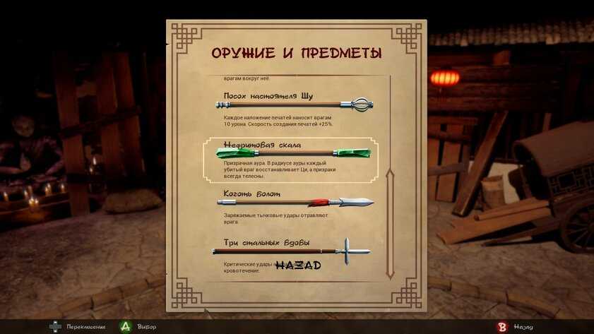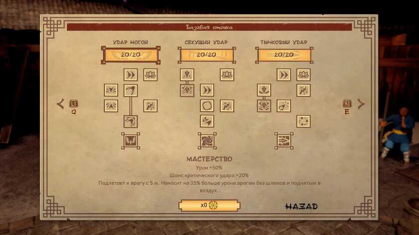 По ходу нашего продвижения всё ближе к цели, враги будут появляться новые, ещё более бронированные и с серьёзными железками. Только вот мы тоже будем получать опыт, запоминать не такие уж и сложные тайминги, прокачиваться. У нас будет первоначально 3 ветки, чуть позже ещё 3, а ещё чуть позже ещё 3. Только вот последние 6 веток — это приёмы, на работу которых нужна ярость или адреналин, энергия ци, короче. Для чего надо будет сначала помахать посохом в обычном режиме, так что советую прокачать сперва начальные 3 ветки.