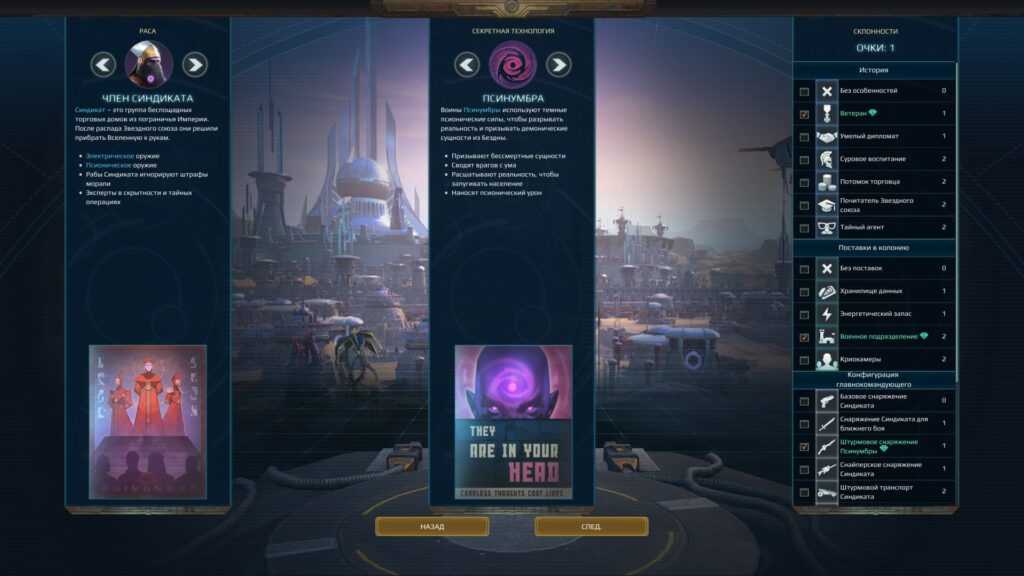 История, поставки в колонию, конфигурация главнокомандующего и пороки определяют стартовые бонусы и штрафы. Пороки, кстати, имеют как отрицательный эффект, так и положительный, а также дают возможность взять более вкусные перки в других категориях, поэтому не бойтесь их брать.