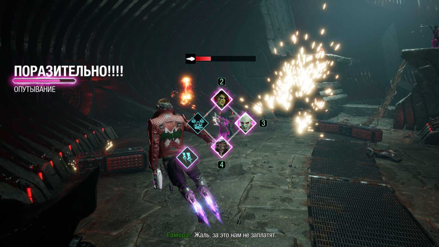 Задумка крутая, и пользоваться ей приятно… первые десять раз. После летучка кажется чересчур затянутой. Друзья делятся переживаниями, Квилл подбирает нужные слова и все несутся в бой — процесс занимает секунд 40, и пропустить лирику никак нельзя. Возможность скипнуть катсцену точно бы не помешала.