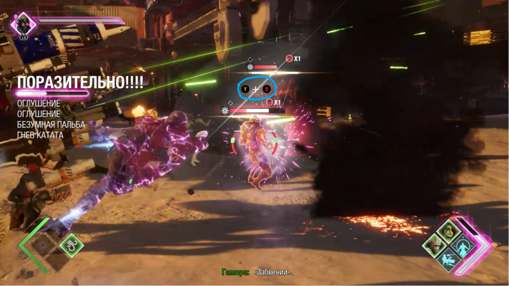 Со второй половины игры, на поле боя можно выполнять крутые комбинации. Вот Дракс проносится сквозь негодяев, разбрасывая их во все стороны. Затем Ракета бросает гранату, которая вновь стягивает всех в одно место. Грут в это время пускает из земли колючие корни, которые наносят высокий урон. Заниматься подобным увлекательно.