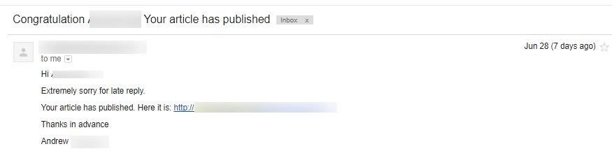 В конкретно этом случае еще не раз пришлось читать о том, что статья скоро будет опубликована и ее сейчас редактируют. Однако все было не зря и нашу статью опубликовали с чем нас радостно поздравил вебмастер.