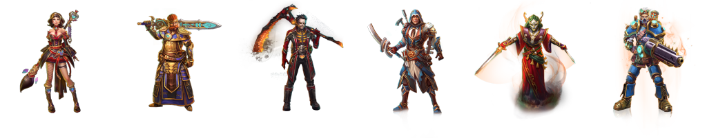 По состоянию на январь 2015 года на выбор 42 героя. Когда игра начнется, вам будет предложено выбрать фракцию. Большинство героев разделяют то же самое геймплей механики для обеих фракций идентичны, за исключением внешнего вида. У каждой фракции есть один уникальный герой; Ха’ка и Да’ка, принадлежащие Kingdom of Adornia и Dokht Imperium соответственно, имеют схожую механику, но обладают одной способностью, которая различается в зависимости от выбора игрока.