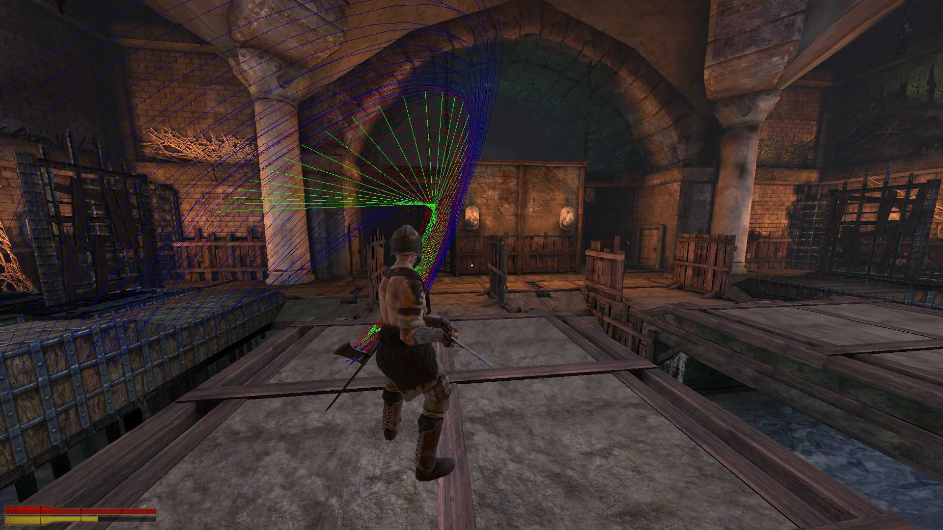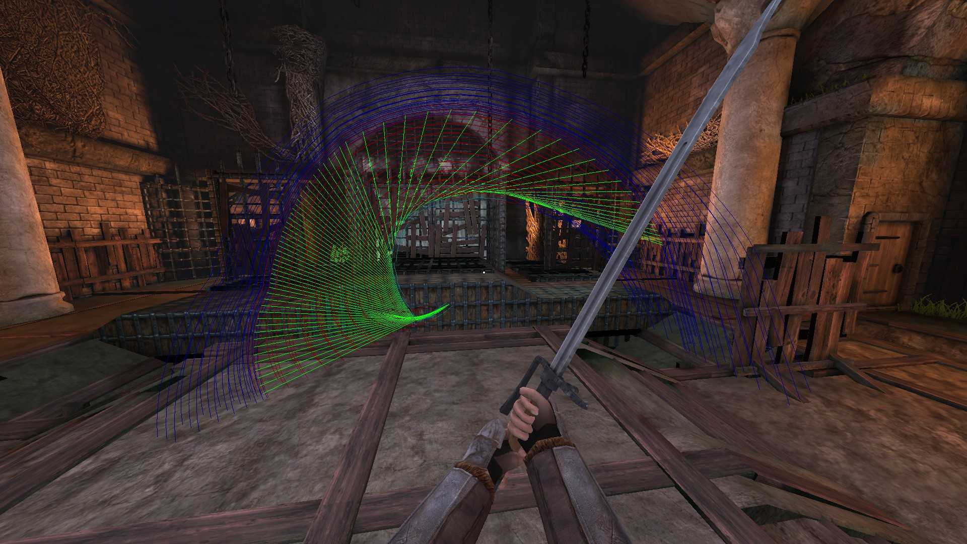 Если создать сервер в синглплеере и ввести команду aoc_drawtracer 1, и начать бить в воздух, то вы увидите, что удары имеют свою… хм… площадь и для разных ударов эти линии разные, и они развиваются со временем.