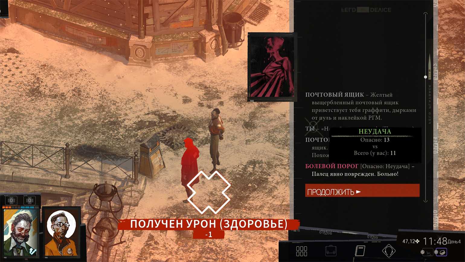 Вот только вашему персонажу уже много лет, а причиной его внезапной амнезии стал недельный запой, случившийся из-за нервного срыва. Поэтому играется Disco Elysium совсем иначе, нежели другие RPG, — ведь из-за возрастных болячек и долгих лет обильных возлияний у героя здесь куда больше шансов получить инфаркт, пнув почтовый ящик, или сойти с ума после того, как ему отказали в свидании.