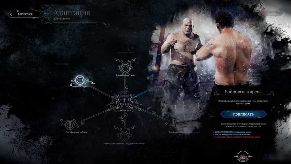 Смотришь, чем же можно поправить людское горе и заткнуть дыру в обеспечении буржуйки углем, и обратно вспоминаешь про сеттинг. Вот играл бы ты в какой-нибудь тайкун про торговлю и сейчас решал бы, отправлять караван в село Петино или хутор Добрый, а тут у нас стоит вопрос – устраивать на новом месте кладбище или просто покидать трупы в снег. И чтобы рабочий класс подобрел, ты не парк строишь, но арену для ночных кулачных боев.