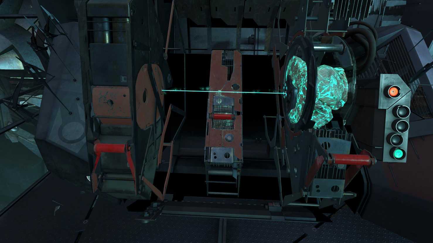 Если внимательно изучите блоки, увидите, что луч выходит только из первого отсека. Поверните ёмкость таким образом, чтобы луч попал и на соседнюю ячейку. Повторите действия с остальными блоками, и вскоре механизм разблокирует путь дальше.
