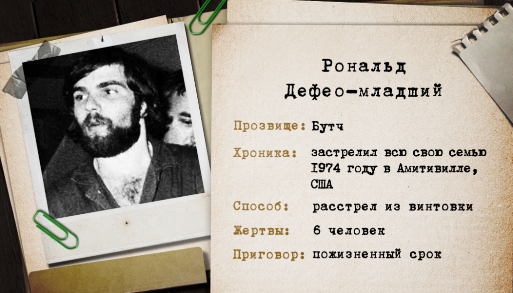 Сначала Рональд отрицал свою вину, но путался в показаниях. Следствию удалось его разговорить и доказать причастность. Мотивы ужасного поступка преступник так и не объяснил. Все это случилось в доме в Амитивилле, что впоследствии породило легенду «Ужас Амитивилля» и фильмы-хорроры. Однако все прозаичнее. Рональд с детства терпел побои жестокого отца-мафиози и нападки сверстников из-за его лишнего веса. Похудеть ему помог амфетамин. Все это привело к проблемам психики и вспышкам агрессии.