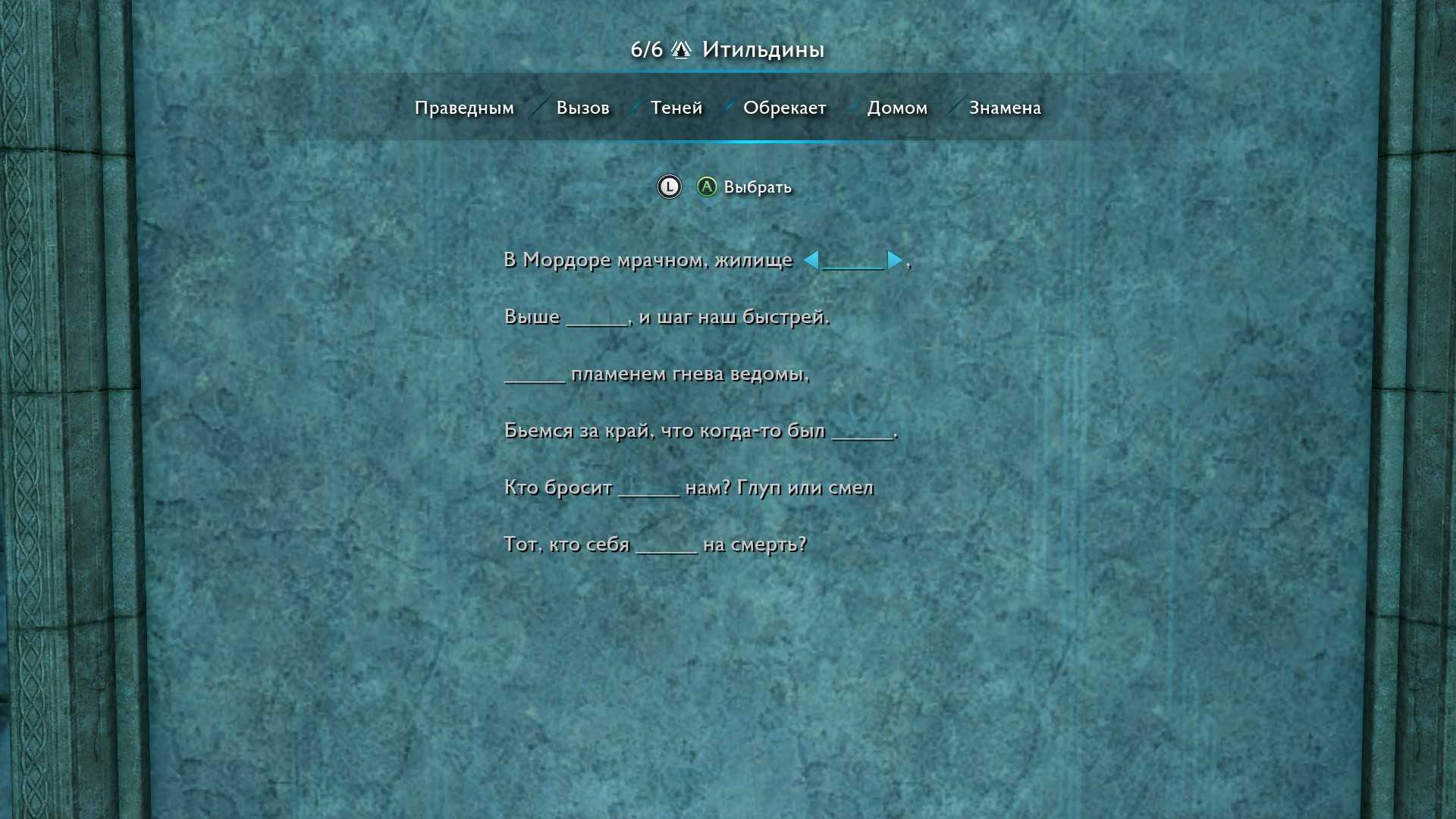 Эта головоломка предлагает расставить следующие слова: Коварство, Ярость, Отравлен, Павших, Гниль, Окутан.