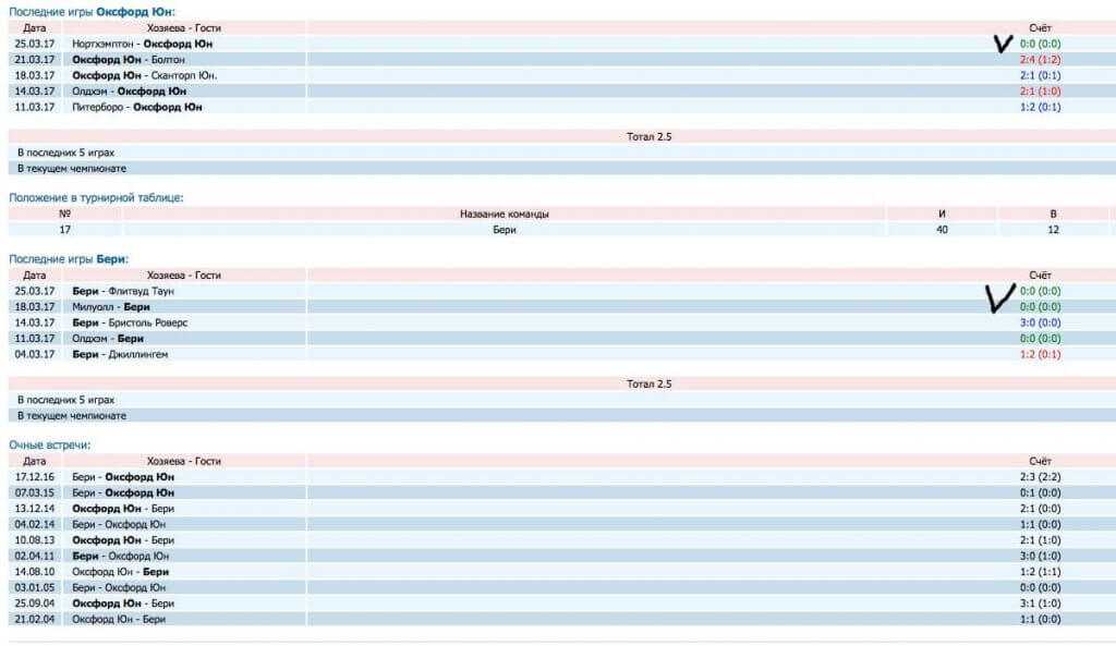 - Затем смотрим очные матчи этих команд. Т.е. как они сыграли последние игры между собой. Если последние 2-3 очные встречи заканчивались с результатом ТБ 4 (т.е. было забито 4 и более голов) то этот матч нам подходит. Но опять же, не стоит опускать во внимании последние игры каждой из выбранных команд. Если у обеих команд давно не было результативных игр (было забито 0 или 1 гол) то есть большая вероятность что скоро они сыграют игру с большим количеством забитых мячей. Так что в этом случае лучше не брать такие команды.