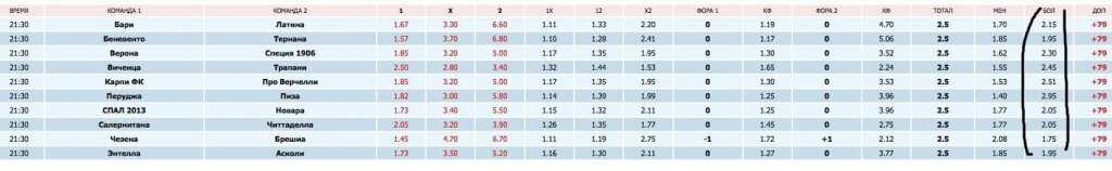 - Далее смотрим какие коэф. БК дают на ТБ 2.5 и выбираем матчи где на ТБ 2.5 коэффициент не ниже 1.9-2, но и не слишком большой (до 2.5-2.6).