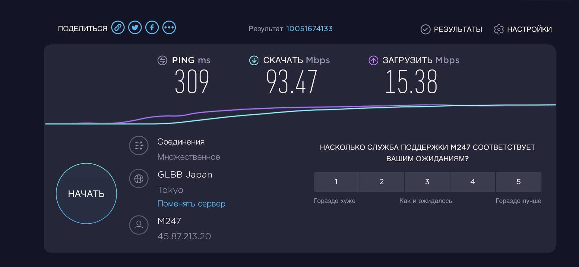 Серверы Surfshark находятся в шестидесяти странах мира. Их количество превышает тысячу штук. Вот скорости, когда я подключился через статичный японский IP: