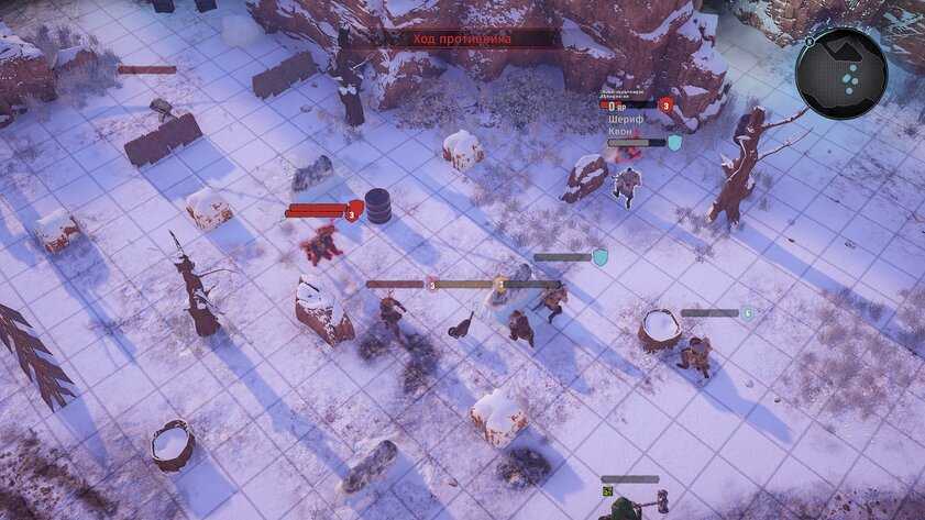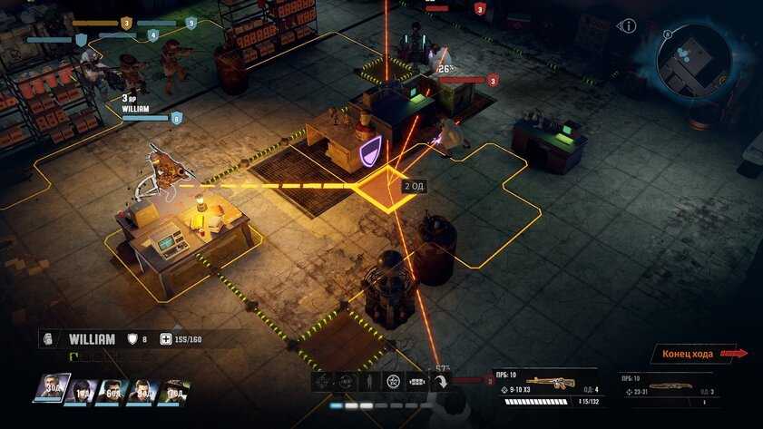 Почти идеальная позиция — все в укрытии, враги на расстоянии выстрела, есть даже две гранаты в запасеОбязательно изучите оружие в руках своих персонажей, чтобы правильно отправлять их на перестрелку. Допустим, у меня у одного героя помповый дробовик — было бы крайне глупо использовать его на дальней дистанции. Аналогично работает и снайперская винтовка — отправлять персонажа поближе и стрелять впритык просто глупо. Также не забывайте считать очки действия, чтобы всегда после передвижения или выстрела иметь возможность спрятаться за укрытие. Они здесь играют важнейшую роль — половина щита даёт частичную защиту, полный щит почти на 100% защищает от попадания из огнестрельного оружия врага. Если хотите выжить, то не забывайте после атаки прятаться.