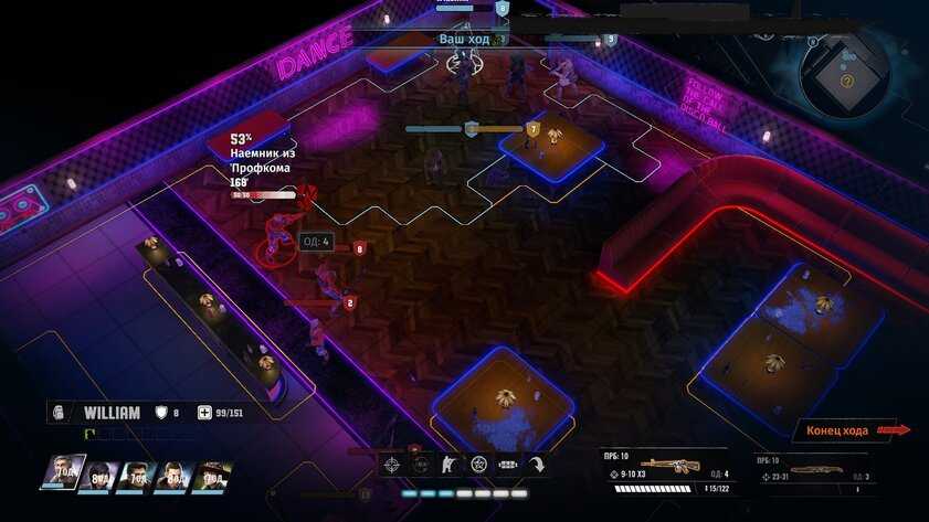 Что ж, пошаговые бои. Если вы играли в XCOM, ничего нового не увидите. Попадая в поле зрения противников, вы начнете бой — поле покроется сеткой и разделится на клетки, а у каждого юнита появятся очки действий, которые можно потратить за один ход.