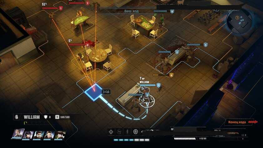 Из ключевых боевых возможностей — прямая атака (огнестрел или холодное оружие), использование предметов из инвентаря (гранаты, лечилки), уничтожение вражеской инфраструктуры (отключение питания роботам, установка ловушек), тактические маневры с целью занятия выгодных и безопасных точек. Потратив все очки действий, персонажи могут занять оборонительную или атакующую позицию, которая даст бонусы во время хода противников. Ну и, наконец, у каждого героя есть своего рода ульта — она заряжается после нескольких удачных выстрелов и позволяет нанести больше урона.