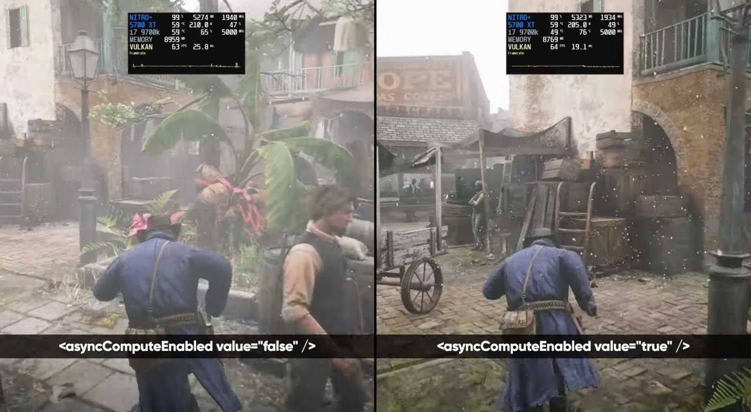 Судя по информации из интернета, в игре по-умолчанию выключен async compute, если его включить (:\Documents\Rockstar Games\Red Dead Redemption 2\Settings\system.xml), то улучшается фреймтайм и минимальная частота кадров, пропадают фризы и статтеры. Работает на Nvidia, так и на картах AMD.