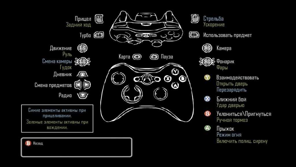 - Е – садиться в машину, открывать двери, взаимодействовать с другими персонажами, сломать предмет в меню (если удержать).