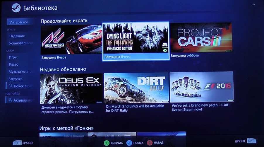 После подключения режим Big Picture Steam загорается, и вы можете играть так же, как вы сидели перед вашим компьютером.