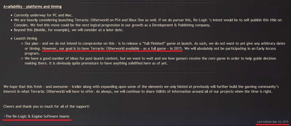 Мы будем работать рука об руку вместе с Engine Software, чтобы сохранить динамику разработки в ближайшие недели и месяцы. Мы уверены в этом новом подходе, и будьте уверены, мы будем тесно связаны, чтобы Terraria: Otherworld стала проектом, по-настоящему достойным Terraria. Мы не можем сказать вам дату, приоритет, в первую очередь на том, чтобы сделать игру качественно. Это говорит о том, что нам предстоит огромное количество работы, чтобы не только сделать игру, но и качественно доработать её. Как только мы узнаем больше, мы сообщим вам, так что ждите спойлеров.»terraria и Terraria: Otherworld»