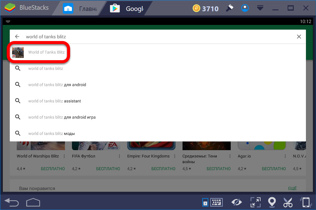 - Наберите при помощи клавиатуры название необходимой игры, к примеру «World of Tanks Blitz». Выберите подходящее приложение в списке доступных совпадений.