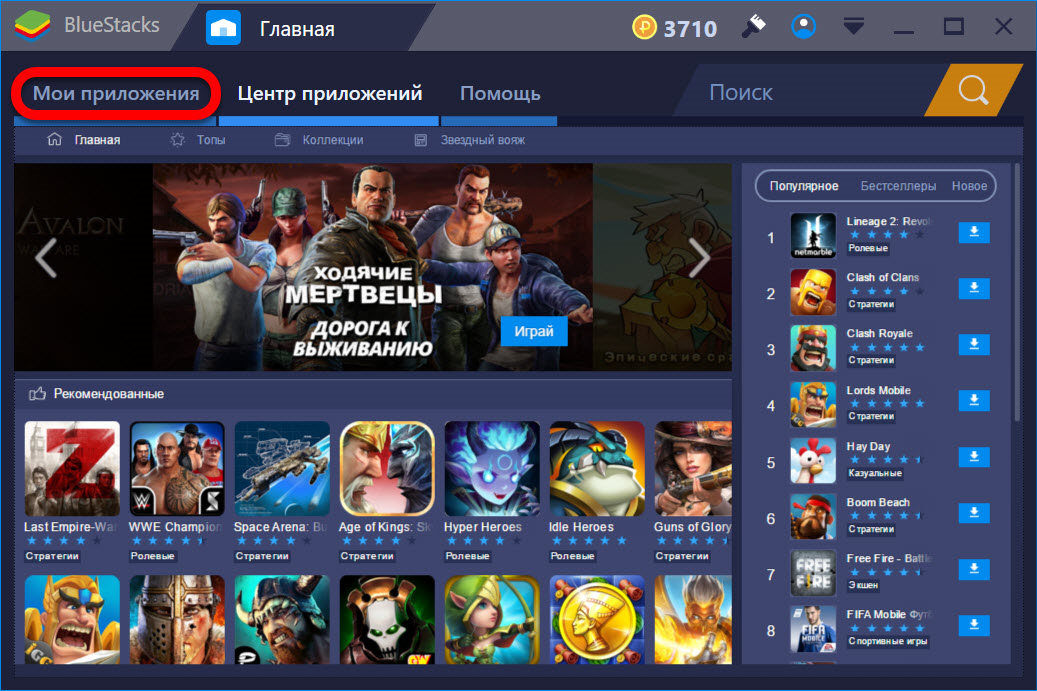 - Запустите программу BlueStacks, воспользовавшись ссылкой на рабочем столе либо ярлыком из соответствующей папки. Откройте раздел «Мои приложения».