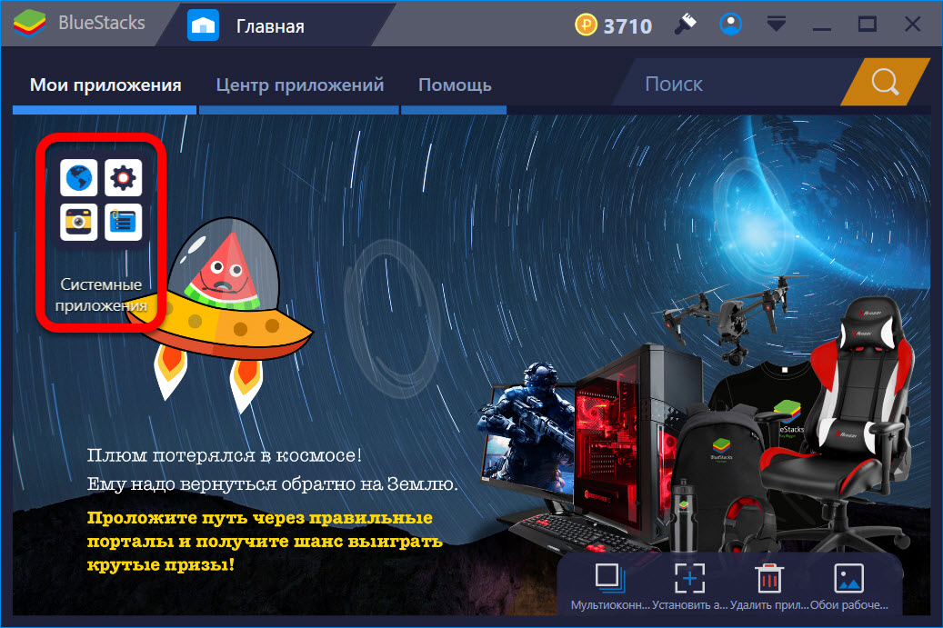 - Далее необходимо перейти в меню основного софта на виртуальном устройстве. Для этого просто щелкните по иконке с названием «Системные приложения».